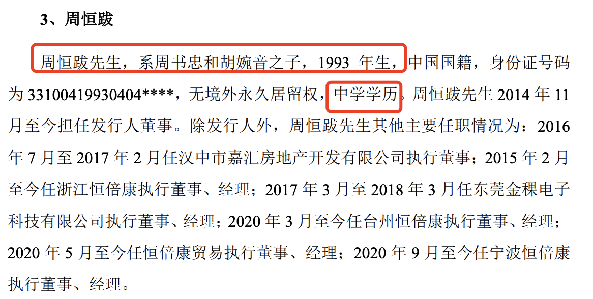 值得一提的是,周书忠和胡婉音之子——周恒跋出生于1993年,仅为中学学历,目前担任恒勃控股董事一职,还是浙江恒倍康、东莞金稞电子科技有限公司、台州恒倍康、恒倍康贸易宁波恒倍康的执行董事、经理。
