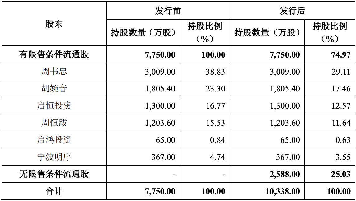 IPO前,周书忠直接持有恒勃控股38.83%的股份,通过启恒投资间接持有该公司14.06%的股份,合计持股52.89%;胡婉音直接持股23.30%,通过启恒投资间接持股0.17%,合计持股23.47%;周恒跋直接持有该公司15.53%的股份,三人合计持有恒勃控股91.89%的股权。