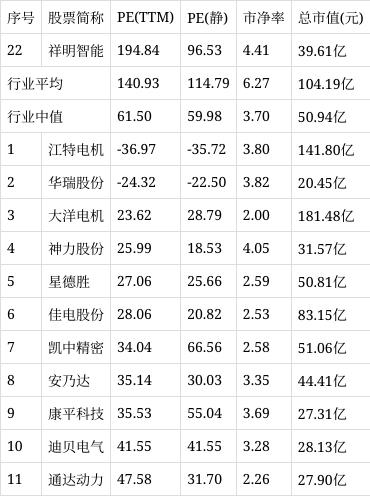 从行业市盈率排名来看,公司所处的电机行业市盈率平均140.93倍,行业中值61.50倍,祥明智能排名第22位。