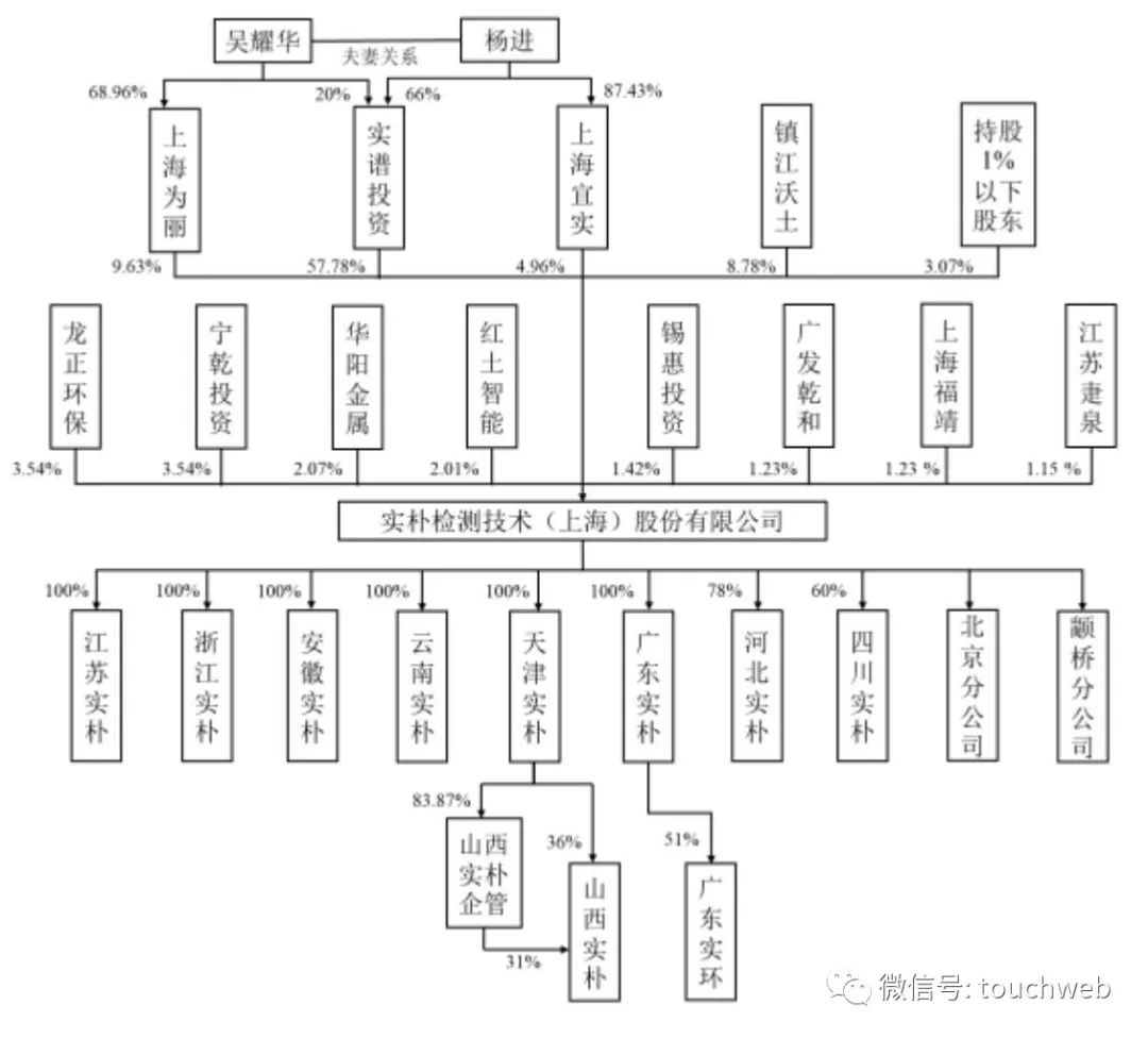 杨进直接持有实谱投资66%股权,吴耀华直接持有实谱投资20%股权,两人通过实谱投资间接持有实朴检测49.69%股权。此外,杨进直接持有上海宜实87.43%股权,并通过上海宜实间接持有实朴检测4.33%股权;吴耀华直接持有上海为丽68.96%股权,并通过上海为丽间接持有实朴检测6.64%股权。