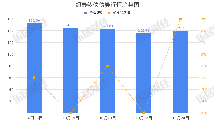 乐居财经 10月25日,“纽泰转债”(123201)下午盘拉高,截至14:10,涨幅14.02%,报159.40元。总成交量90.31万手,成交额13.84亿元。