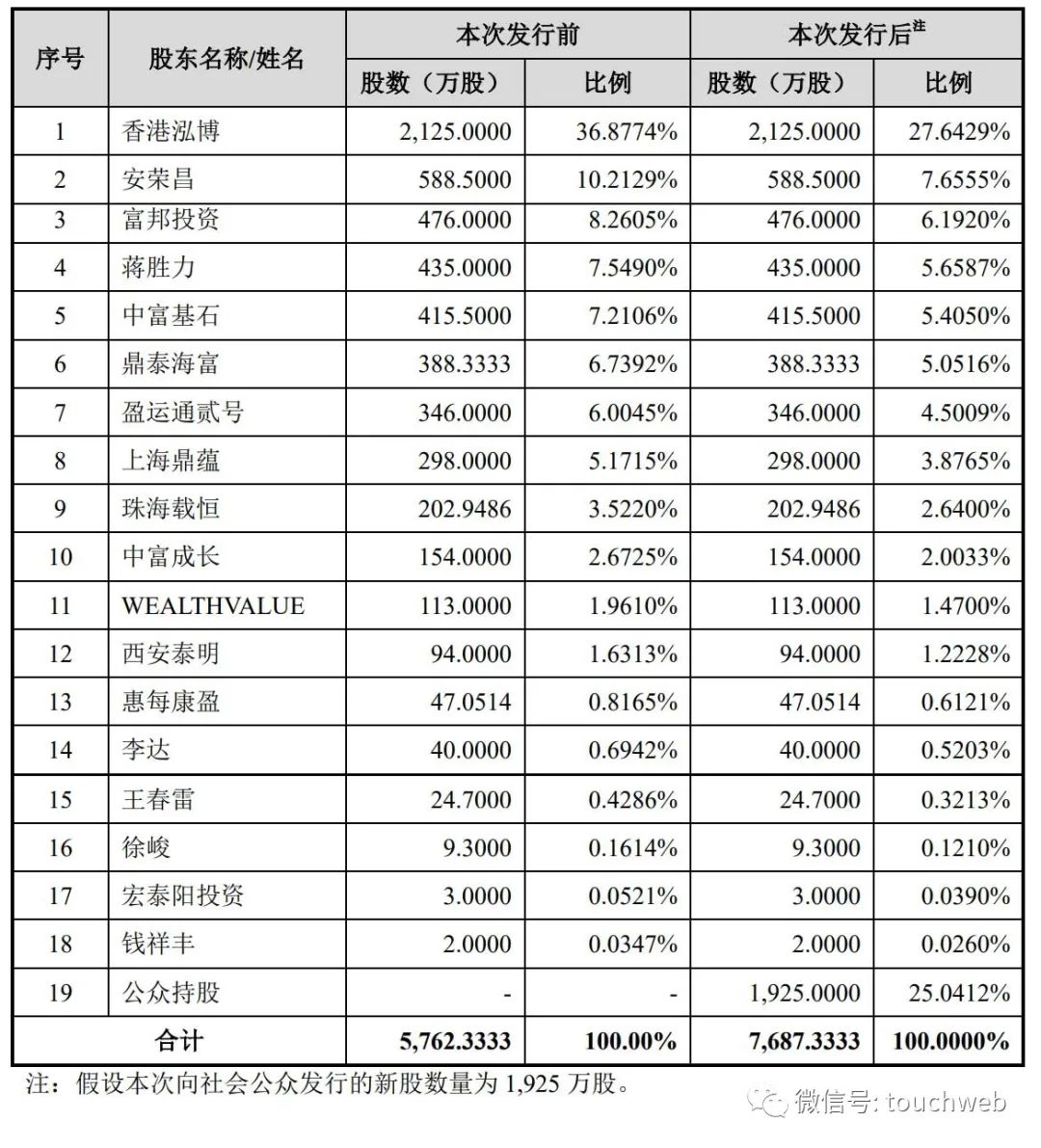 IPO后,香港泓博持股27.6429%,安荣昌持股7.6555%,富邦投资持股6.192%,蒋胜力持股5.6587%,中富基石持股5.405%,鼎泰海富持股5.0516%,盈运通贰号持股为4.5009%,上海鼎蕴持股为3.8765%,珠海载恒持股为2.64%,中富成长持股为2.0033%;
