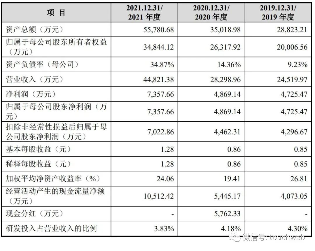 招股书显示,泓博智源2019年、2020年、2021年营收分别为2.45亿元、2.83亿元、4.48亿元;净利分别为4725.47万元、4869万元、7357.66万元;扣非后净利分别为4296.67万元、4462.3万元、7022.86万元。