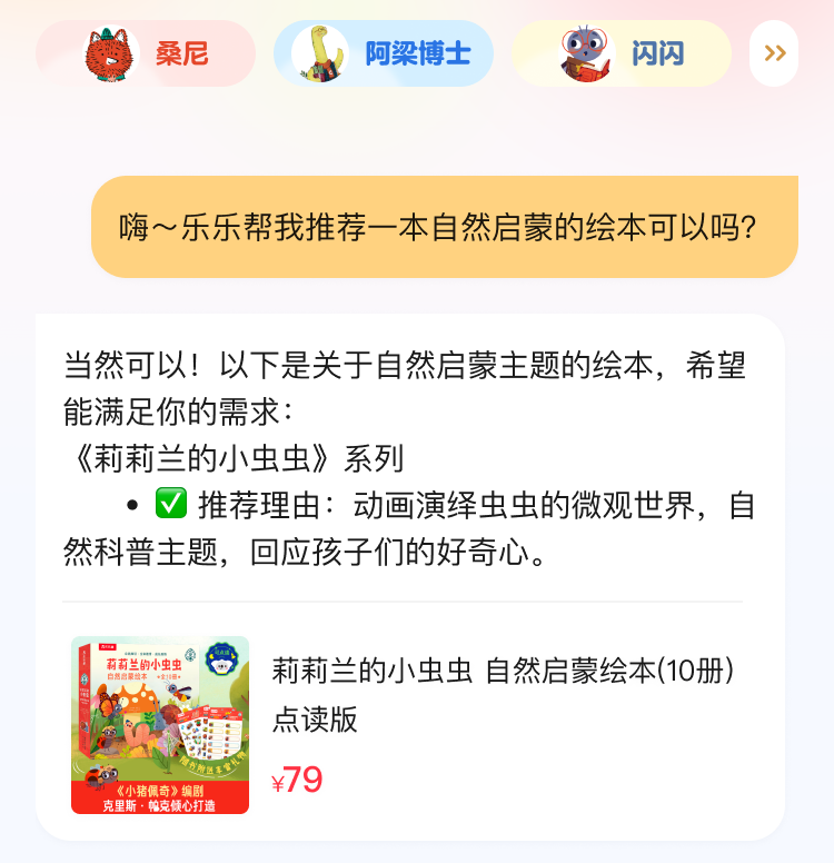 依托荣信文化多年积累的优质内容资源,智趣科技将AI技术与经典内容IP深度融合。本次以公司“乐乐趣”品牌形象“乐乐”为原型,上线的“AI乐乐”智能体能够为孩子们讲解公司旗下众多的科普知识、奇妙故事,并针对孩子们的问题提供解决建议以及智能阅读推荐服务。同时,更是重磅推出“桑尼”、“阿梁博士”、“闪闪”、“侃侃”等5款具备IP属性的AI助读智能体。其中,“闪闪”是针对公司爆款IP“莉莉兰的小虫虫”(系列图书累计销量超300万册)量身打造的智能体,能够精准还原小主人公智多星“闪闪”的角色特质,并通过情感化交互、科普化延伸两大核心功能,打破传统童书的静态阅读边界。