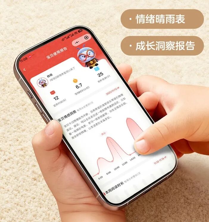 在功能上,闪闪不仅能随时陪孩子聊天、回应孩子的奇思妙想,还能通过声纹识别与全家人自然互动;它可精准捕捉孩子的情绪变化,并同步至小程序,方便家长查看;AI角色扮演功能能充分激发孩子的表达力与想象力。同时,简单的语音控制让孩子可轻松独立操作,在日常互动中培养自主性。