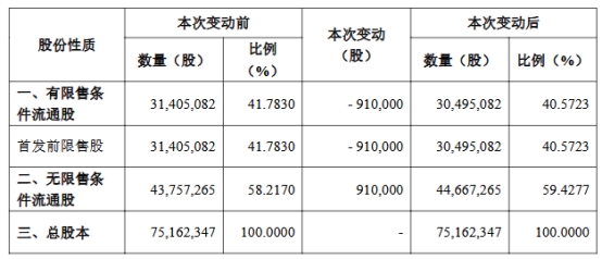 截至公告日,公司总股本为75,162,347股,其中无限售条件流通股票数量为43,757,265股,占总股本的比例为58.2170%;有限售条件流通股票数量为31,405,082股,占总股本的比例为41.7830%。