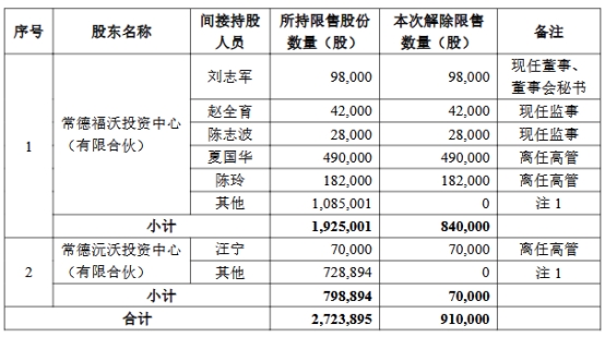 飞沃科技(301232.SZ)今日解除限售的股份数量为910,000股,占公司总股本的1.2107%。