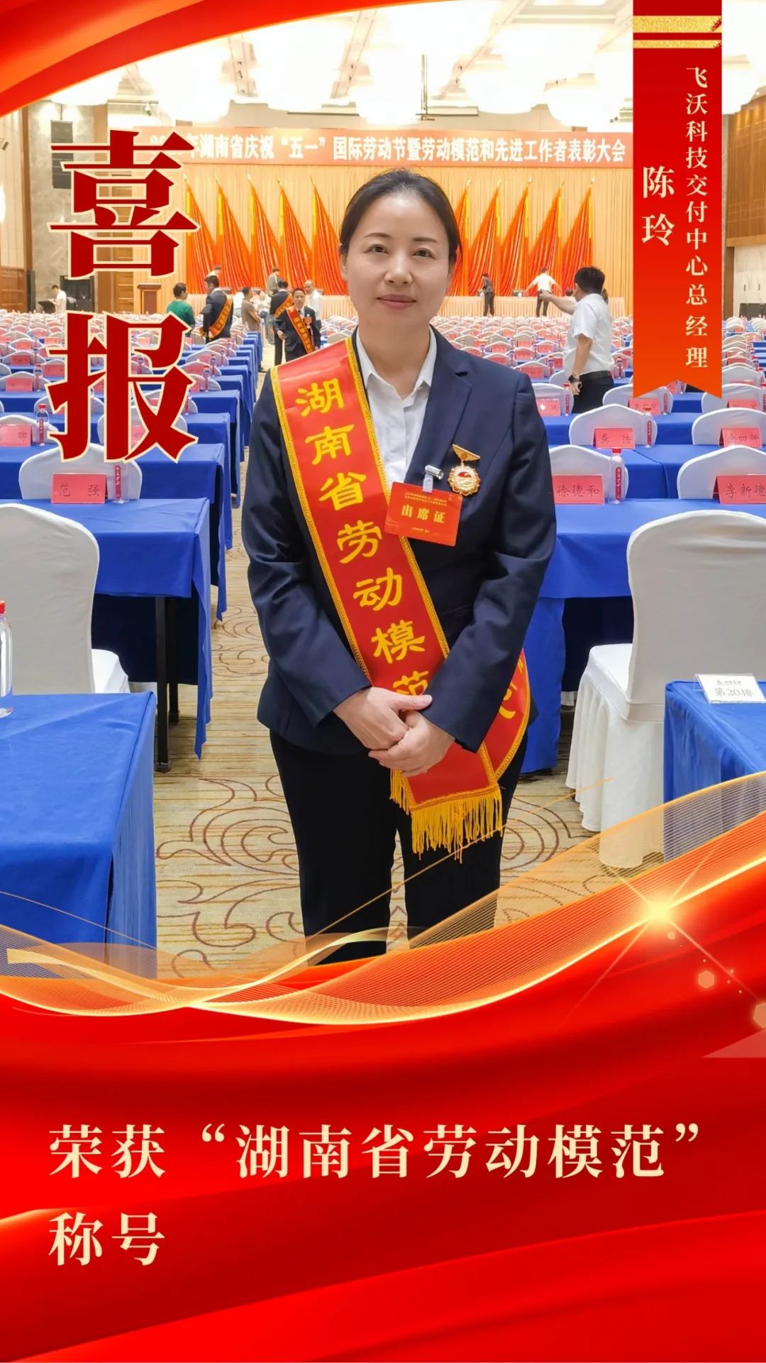 4月28日,2025年湖南省庆祝“五一”国际劳动节暨劳动模范和先进工作者表彰大会在长沙盛大召开。飞沃科技交付中心总经理陈玲荣获“湖南省劳动模范”称号,并在现场接受表彰。