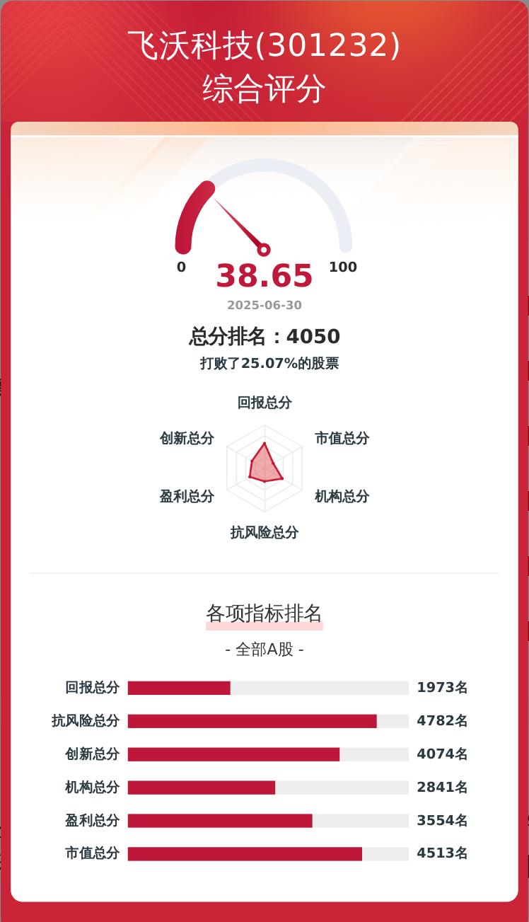 金融界上市公司研究院构建了一套上市公司韧性评价体系,从企业盈利、科技创新、股东回报、经营抗风险、市值表现及机构吸引力六个维度对企业进行量化评分,满分为100分。飞沃科技的韧性评价总分为38.65分,在A股5405家可比上市公司中排名第4050位。