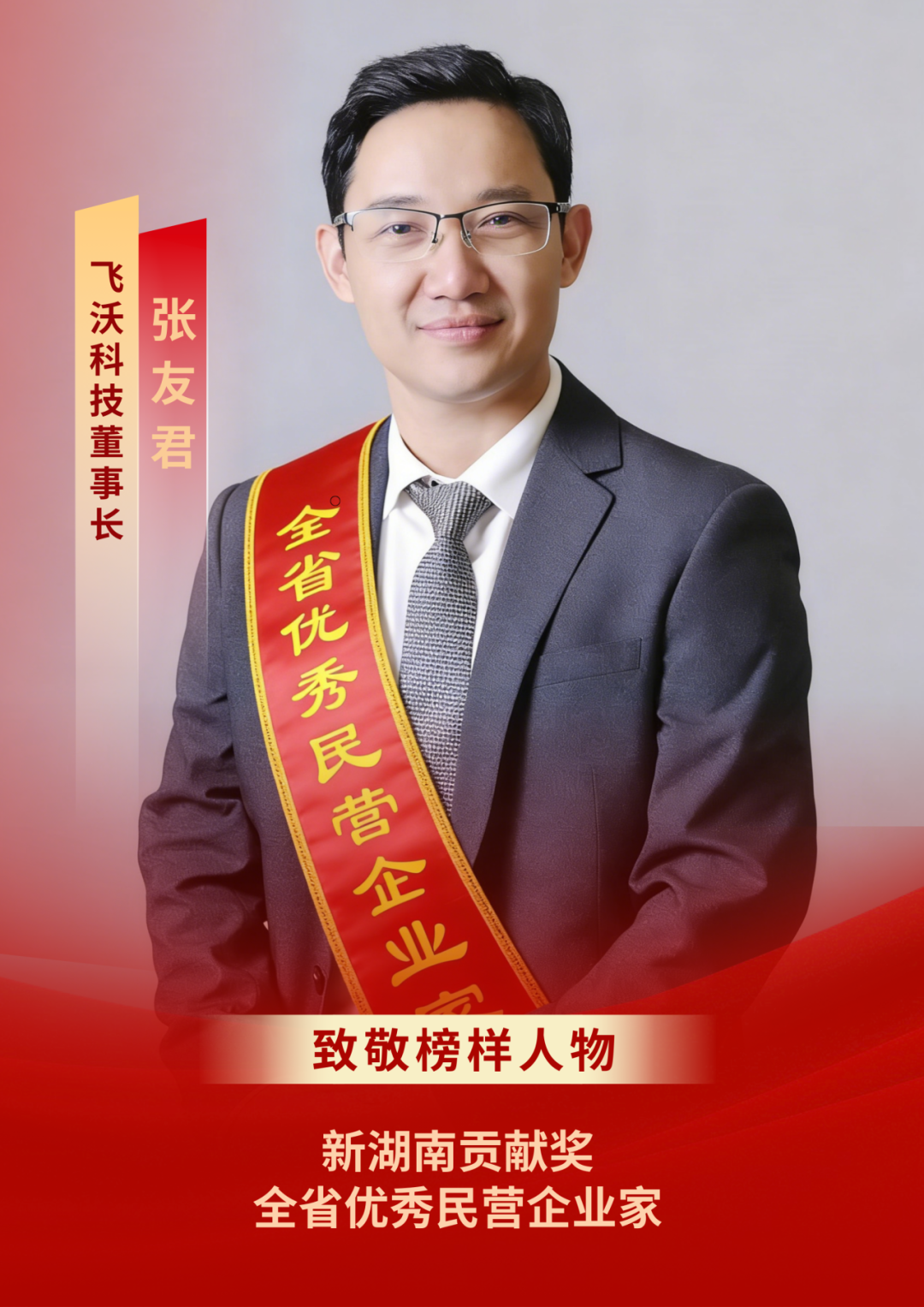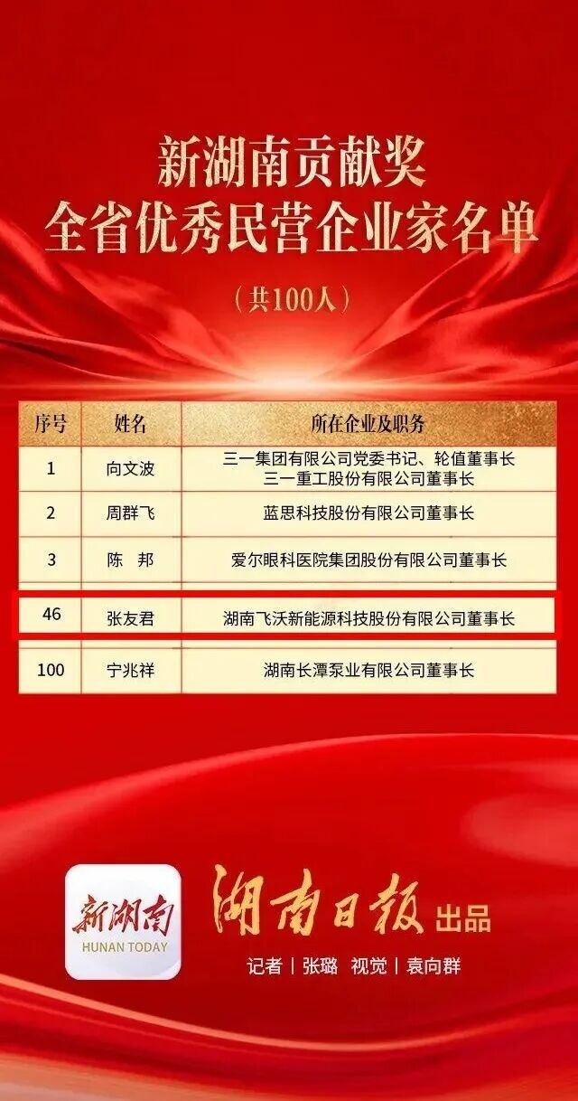 2月24日,全省促进民营经济发展壮大暨企业服务年行动部署大会在长沙召开。会上宣读了《中共湖南省委湖南省人民政府关于表彰新湖南贡献奖全省优秀民营企业家的决定》,湖南飞沃新能源科技股份有限公司董事长张友君凭借在产业发展、科技创新、社会责任等领域的突出贡献,荣获“新湖南贡献奖全省优秀民营企业家”称号。这份荣誉不仅是对张友君个人创业初心与实干精神的认可,更是对飞沃科技深耕高端制造、助力湖南民营经济高质量发展的高度肯定。