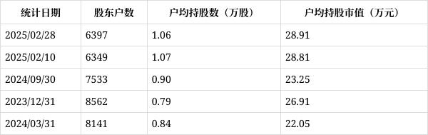 从3月5日公开信息显示,五洲医疗截至2025年2月28日公司股东户数为6397户,较上期(2025年2月10日)增加48户,增幅为0.76%,变化不大。