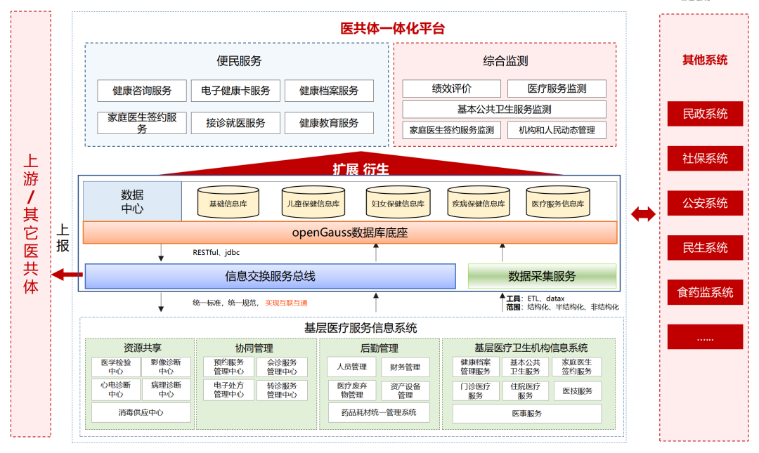 软通动力“基于鲲鹏硬件的信创医共体解决方案”是集鲲鹏服务器、openEuler操作系统、openGuass数据库以及软通自研医共体平台应用为一体的全国产化软硬件平台,完全符合医疗体系数据标准,安全性更高、性能更优异。该方案不仅能解决中小医疗单位的当下难题,还提高了其数字化、智能化水平,周边HIS系统也可无缝接入软通医共体数据中台。该解决方案架构部署具备如下特点: