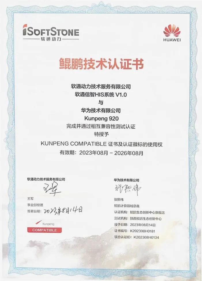 同时,软通动力“基于鲲鹏硬件的信创医共体解决方案”在兼容性、稳定性、安全性、功耗、功能等五大维度的测试均符合鲲鹏技术标准,完全适配华为鲲鹏 920 处理器,且顺利通过华为鲲鹏兼容性测试认证,并取得KUNPENG COMPATIBLE证书及认证徽标的使用权。这表明软通动力面向行业构建解决方案所具备的自主创新能力,不仅能为广大客户提供更加广阔的基础环境选择空间,还能为国产操作系统的稳健更迭提供更加优质的技术服务与安全保障。