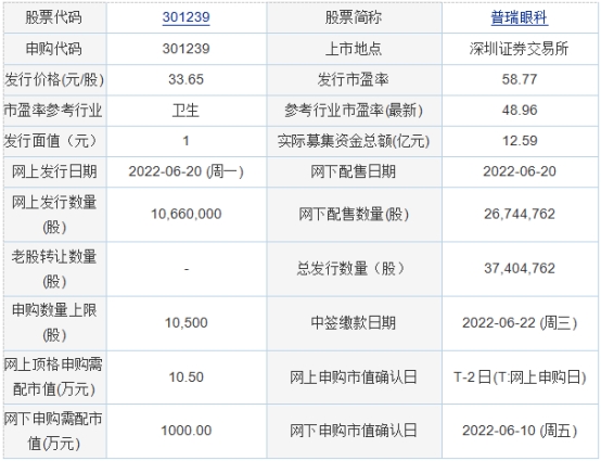 普瑞眼科2022年6月17日披露的首次公开发行股票并在创业板上市发行公告显示,若本次发行成功,预计普瑞眼科募集资金总额为125,867.02万元,扣除预计发行费用约15,973.45万元(含增值税,含印花税)后,预计募集资金净额约为109,893.57万元,如存在尾数差异,为四舍五入造成。