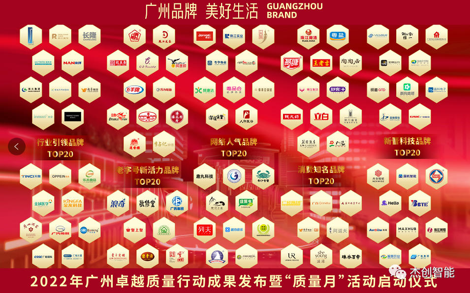 近期,2022年广州市卓越质量行动成果发布暨“质量月”活动启动仪式在白云国际会议中心举行。启动仪式现场隆重发布了广州市“百强质量品牌”企业名单,杰创智能科技股份有限公司上榜“新晋科技品牌榜TOP20”。