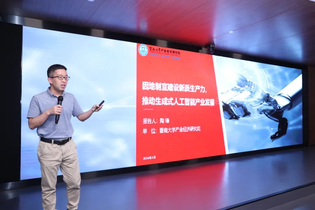 暨南大学产业经济研究院院长陶锋,分享了《广东省数字经济百强企业研究项目最新进展报告暨人工智能产业研究报告》。陶院长强调,在科技革命和产业变革的浪潮中,持续推动产业融合创新,创造跨越传统边界的新产品、新业态、新模式,引导传统产业的变革和新兴产业的快速成长至关重要。