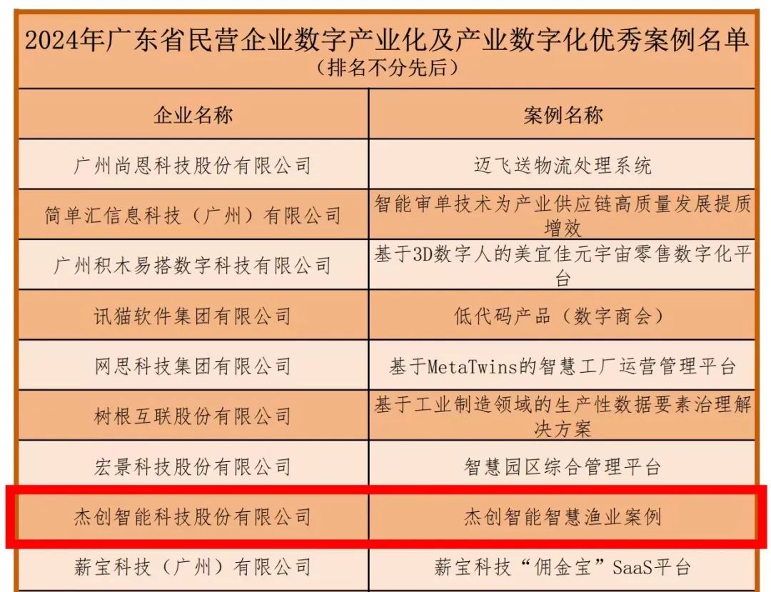 为深入贯彻落实党中央、国务院关于加快数字化发展,建设数字中国的决策部署,加快发展新质生产力,落实《全国工商联关于推动民营企业加快数字化转型发展的意见》等系列通知精神,广东省工商联开展了2024年广东省民营企业数字产业化及产业数字化优秀案例的组织推荐工作。经专家组集体评审,共选出45个案例为2024年广东省民营企业数字产业化及产业数字化优秀案例,杰创智能智慧渔业案例成功入选。