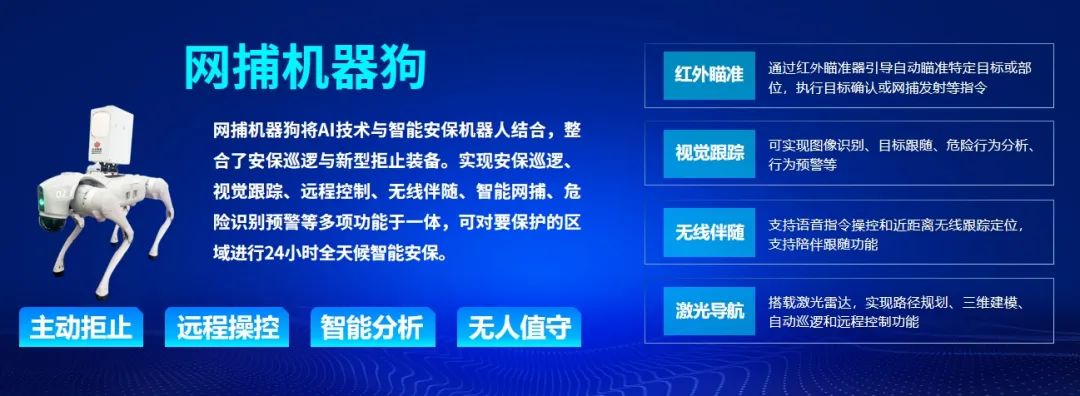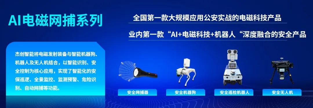 杰创智能AI电磁网捕器系列产品是全国首款大规模应用于公安实战的“AI+电磁科技+机器人”深度融合的安全产品,不但将电磁发射装备与智能机器狗、机器人及无人机结合,更以智能识别、安全控制为核心应用,实现智能化的安保巡逻、全景监控、监测预警、危险识别、自动网捕等功能。