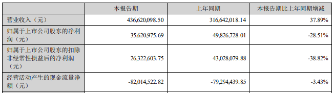 华融化学(301256.SZ)昨晚披露的2022年半年度报告显示,公司今年上半年实现营业收入4.37亿元,同比增长37.89%;归属于上市公司股东的净利润为3562.10万元,同比下降28.51%;归属于上市公司股东的扣除非经常性损益后的净利润为2632.26万元,同比下降38.82%;经营活动产生的现金流量净额为-8201.45万元,上年同期为-7929.44万元。