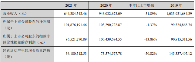 上市前,公司营收已经出现下降。2018年、2019年、2020年,华融化学的营业收入分别为96,631.59万元、103,393.17万元、94,603.27万元;归属于母公司所有者的净利润7447.32万元、9932.49万元、10,329.07万元;扣除非经常性损益后归属于母公司所有者的净利润分别为5048.49万元、9081.53万元、10,043.97万元;经营活动产生的现金流量净额分别为12,358.43万元、14,533.74万元、7357.46万元。