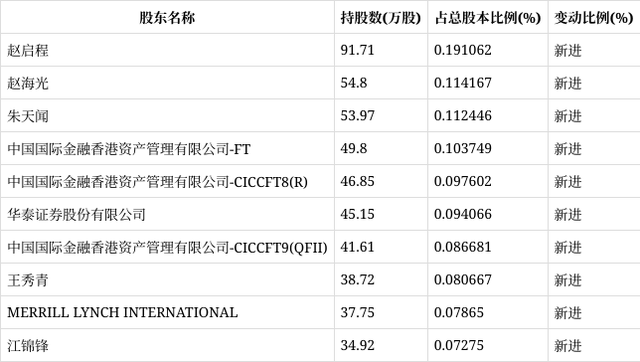 半年报显示,2022年上半年末的公司十大流通股东中,新进股东为赵启程、赵海光、朱天闻、中国国际金融香港资产管理有限公司-FT、中国国际金融香港资产管理有限公司-CICCFT8(R)、华泰证券股份有限公司、中国国际金融香港资产管理有限公司-CICCFT9(QFII)、王秀青、MERRILL LYNCH INTERNATIONAL、江锦锋,取代了一季度末的李卓强、西藏中睿合银投资管理有限公司-中睿合银昊天1期对冲基金、赵善芹、王光坤、柯希明、张锦山、中睿合银昊天3期私募证券投资基金、钮金根、林忠锋、华泰金融控股(香港)有限公司-自有资金。