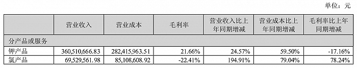 另外,在2018年公司确立并实施“钾延伸、氯转型”的创新发展战略,并于2020年11月关停聚氯乙烯树脂产品生产线,目前主要通过盐酸、次氯酸钠及其他氯产品工艺路线来消纳副产的氯气。受价格较低的普通盐酸销量大幅增长而高等级盐酸尚处于放量过程中,叠加原材料氯化钾价格上涨以及聚氯乙烯停产后相关公用设备折旧等固定成本分摊的影响,使得氯产品整体亏损。从数据看,氯产品营业收入倒是出现了大幅增长,但毛利率也为负值:-22.41%。由此来看,这个“氯转型”之路,还有继续摸索。