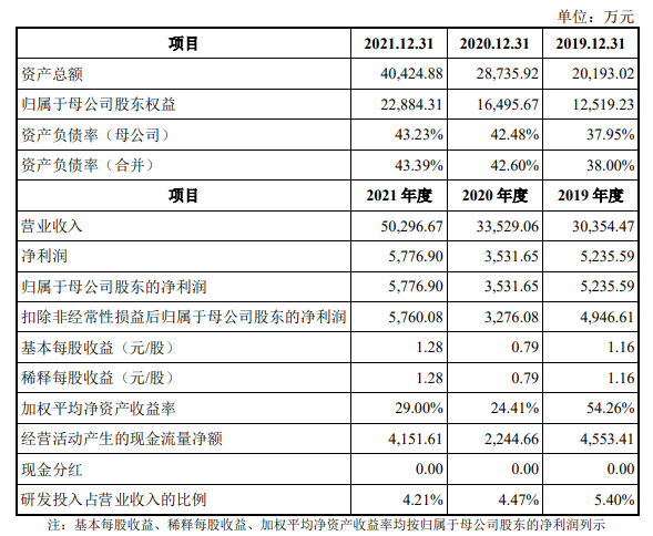 2019年至2021年,普蕊斯的营业收入分别为30,354.47万元、33,529.06万元、50,296.67万元;净利润分别为5235.59万元、3531.65万元、5776.90万元;扣除非经常性损益后归属于母公司股东的净利润分别为4946.61万元、3276.08万元、5760.08万元;经营活动产生的现金流量净额分别为4553.41万元、2244.66万元、4151.61万元。