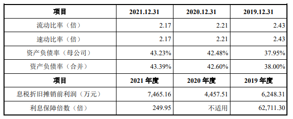 2019年至2021年,普蕊斯的流动比率分别为2.43、2.21和2.17,速动比率2.43、2.21和2.17,资产负债率(合并)分别为38.00%、42.60%和43.39%。