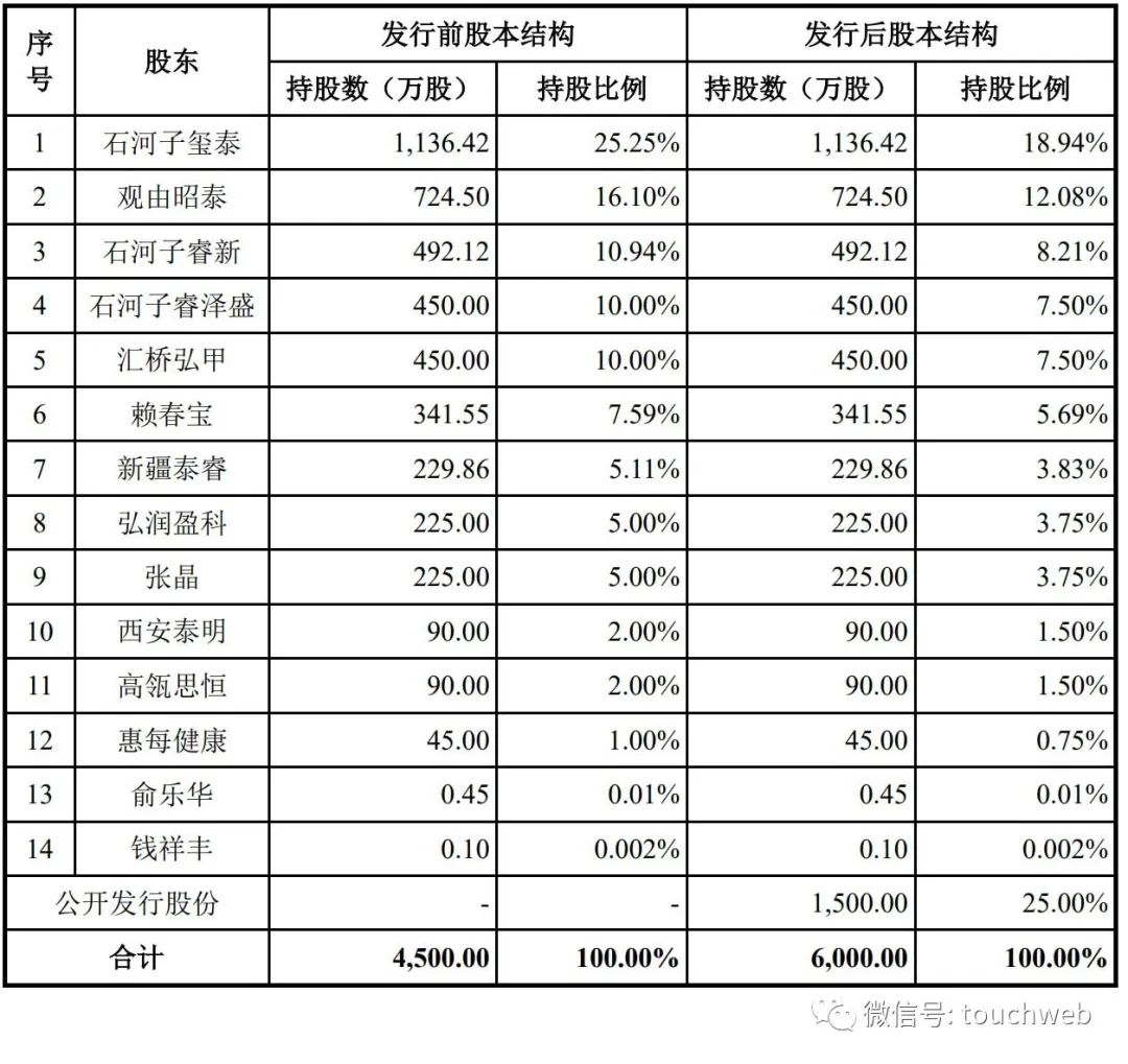 IPO后,石河子玺泰持股18.94%,观由昭泰持股12.08%,石河子睿新持股8.21%,石河子睿泽盛、汇桥弘甲分别持股7.5%,赖春宝直接持股5.69%;