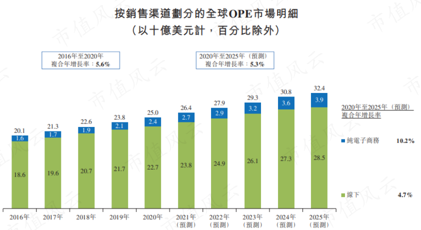 亚马逊虽然规模很大,但从整体来看,线下渠道仍然在全球OPE市场占据主导,2020年线下渠道占比高达91%。