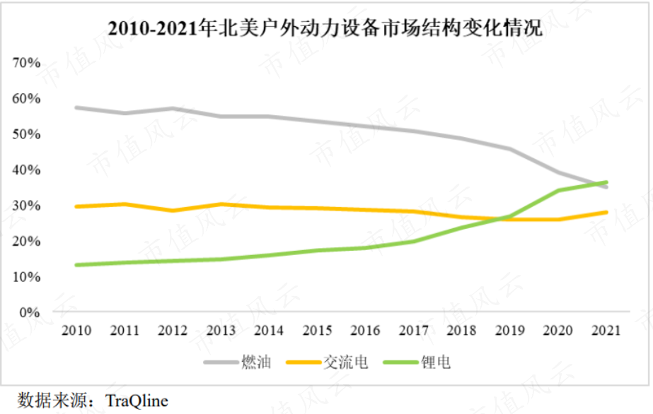 户外动力设备市场与房地产行业息息相关,长期以来增长平稳,近些年的一个重大机遇是向新能源的转型,锂电类工具占比快速提高。