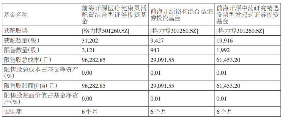 2023年1月31日,前海开源基金公告,公司所管理的部分基金参加了格力博(江苏)股份有限公司(以下简称“发行人”)首次公开发行股票网下申购,并根据发行人公告的限售期安排,网下投资者应当承诺其获配股票数量的10%(向上取整计算)限售期限为自发行人首次公开发行并上市之日起6个月。