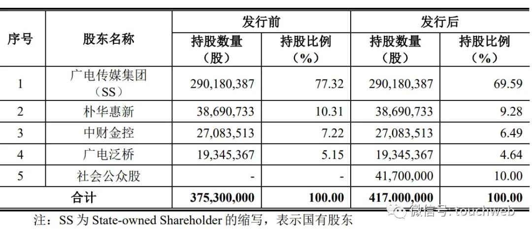 IPO前,广电传媒集团(SS)持股为77.32%,朴华惠新持股为10.31%,中财金控持股为7.22%,广电泛桥持股为5.15%。