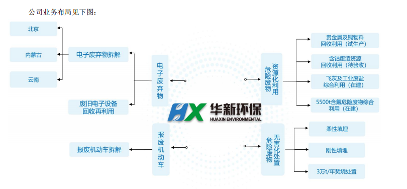 发展至今,华新环保已形成了深厚成熟的固废处理技术,拥有较为完整的业务链条,覆盖从电子废弃物、废旧电子设备和报废机动车的回收,到对其资源化利用获取再生材料和回收再利用产品,再到对36大类危险废物进行无害化处置,实现对固体废物多层次的处置与利用。