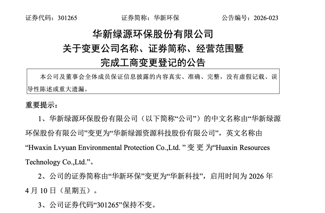 2026年4月9日,华新绿源环保股份有限公司(简称“华新环保”)公告称,因经营与业务发展需要,公司决定变更名称、证券简称及经营范围。4月10日起,公司正式更名为“华新绿源资源科技股份有限公司”,证券简称由“华新环保”变更为“华新科技”。