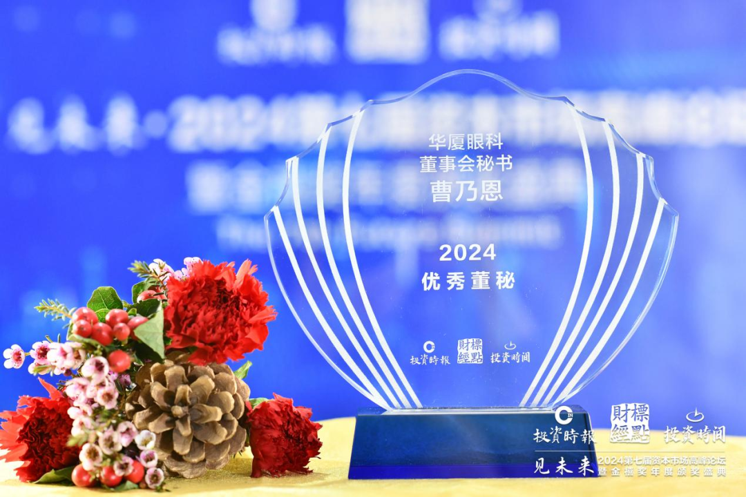 2025年1月3日,“见未来·2024第七届资本市场高峰论坛暨金禧奖年度颁奖盛典”在北京隆重举行。华厦眼科凭借在品牌建设和管理上的突出表现,获评“金禧奖·2024 年度优秀品牌案例”,董事会秘书曹乃恩先生获评“金禧奖·2024 优秀董秘”。