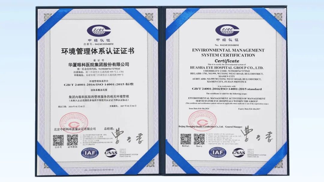 2024年初,华厦眼科医院集团荣获ISO9001:2015质量管理体系标准认证及ISO14001:2015环境管理体系标准认证,标志着集团质量管理体系建设和环境管理体系建设工作在精细化、规范化、标准化、制度化管理上达到国际水平。