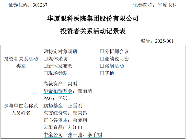 【环球网财经记者田刚】2025年1月15日,上市公司华厦眼科(301267.SZ)发布了《投资者关系活动记录表》,披露公司接待了高毅资产、华泰柏瑞基金、鹏扬基金等多家机构调研,公司董事会秘书曹乃恩等管理层人士参与,并解答投资机构代表提问。