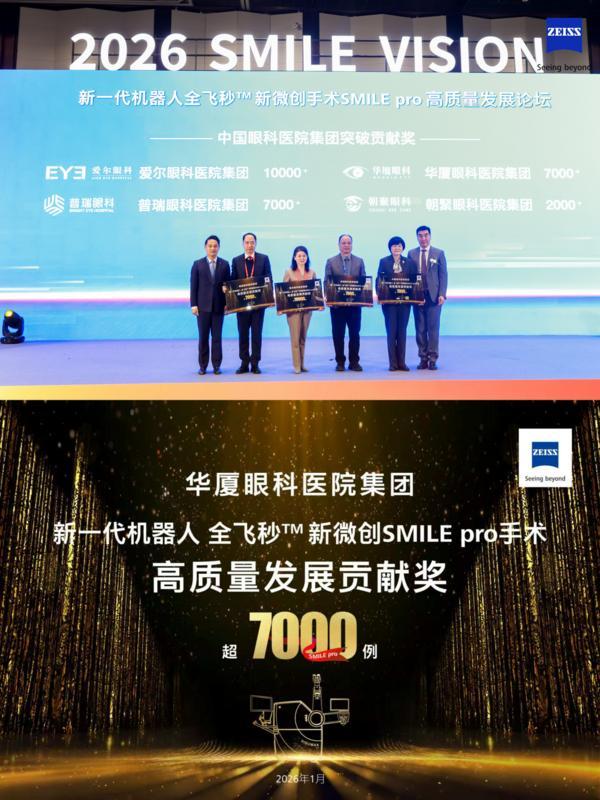 在新一代机器人全飞秒?新微创手术SMILE pro高质量发展论坛上,华厦眼科以超过7000例的临床实践成果,获颁“新一代机器人全飞秒?新微创SMILE pro手术高质量发展贡献奖”。该奖项不仅是对手术数量的肯定,更是对华厦眼科在手术标准化、安全性及术后视觉质量的高度认可。