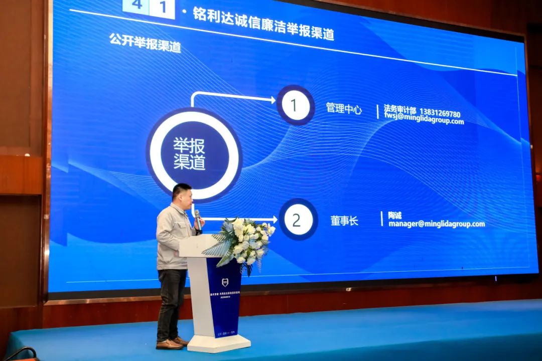 他强调了铭利达集团的诚信廉洁红线以及廉洁采购违约责任,为大家讲解了违反《廉洁协议》案例,提供了铭利达集团诚信廉洁举报渠道。