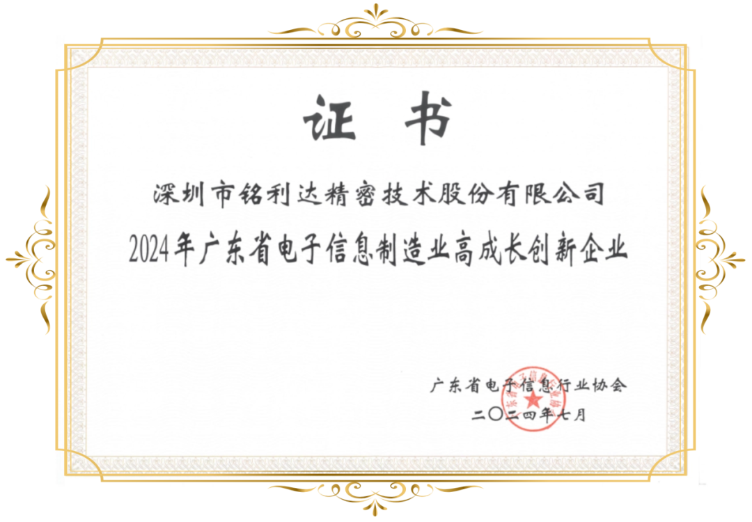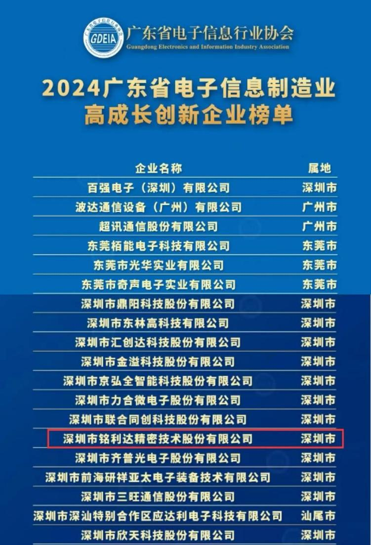 7月19日,2024年广东省新一代电子信息产业发展大会在广州举办,深圳市铭利达精密技术股份有限公司荣登2024年广东省电子信息制造业高成长创新企业榜单。