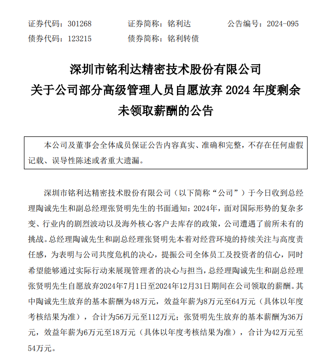 8月20日晚间,铭利达公告称,收到公司总经理陶诚和副总经理张贤明的书面通知,其自愿放弃2024年7月1日至2024年12月31日期间在公司领取的薪酬。