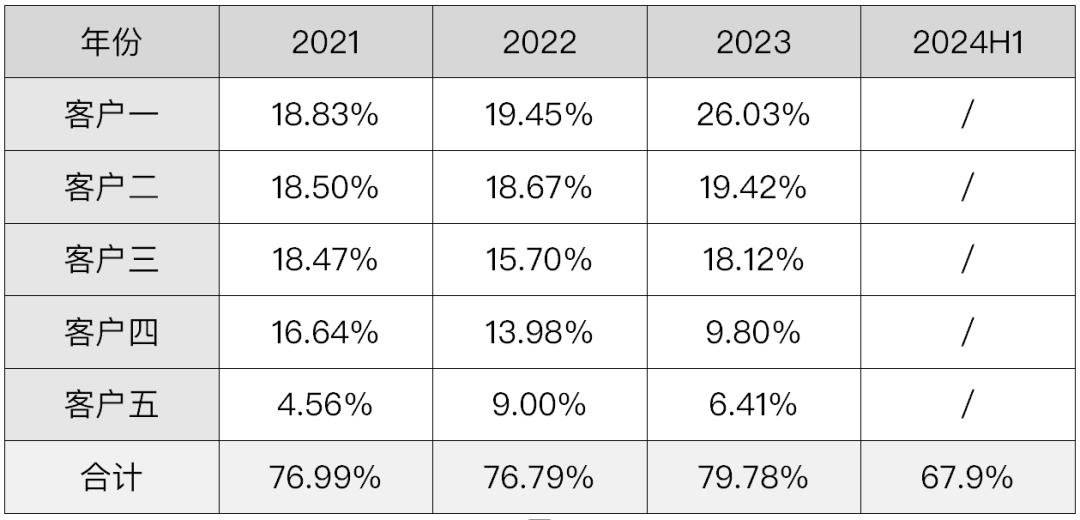 2021年至2023年期间,铭利达前五大客户的销售额占据总营收的80%左右。这一数字虽然在2024年上半年有所下滑,但前五大客户仍为公司贡献了67.9%的营收。