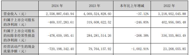 公司2024年实现营业收入25.59亿元,同比下降37.12%;归属于上市公司股东的净利润-4.69亿元,上年同期为3.20亿元;归属于上市公司股东的扣除非经常性损益的净利润-4.79亿元,上年同期为2.84亿元;经营活动产生的现金流量净额为-7.20亿元,上年同期为7976.42万元。
