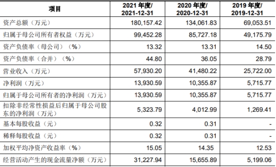2019年、2020年、2021年,华大九天的营业收入分别为25,722.00万元、41,480.22万元、57,930.20万元;归属于母公司所有者的净利润分别为5,715.77万元、10,355.87万元、13,930.59万元;扣除非经常性损益后归属于母公司股东的净利润分别为1,269.41万元、4,012.99万元、5,323.79万元;经营活动产生的现金流量净额分别为5,199.06万元、15,655.89万元、31,227.94万元。