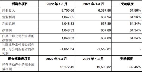 2022年1-3月公司的营业收入为9,700.66万元,较去年同期增长51.86%;净利润为1,048.33万元,较去年同期增长64.34%;扣除非经常性损益后归属于母公司股东的净利润为-1,051.64万元,较去年同期减亏501.16万元;经营活动产生的现金流量净额13,172.49元,较去年同期下降32.45%。