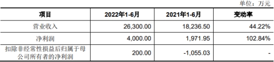 公司预计2022年1-6月营业收入约为26,300.00万元,较去年同期增长44.22%;净利润约为4,000.00万元,较去年同期增长102.84%;扣除非经常性损益后归属于母公司所有者的净利润约为200.00万元,较去年同期实现扭亏为盈,增加1,255.03万元。