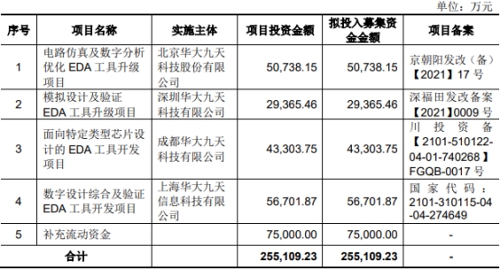 华大九天本次发行募集资金总额354,975.33万元;扣除发行费用后,募集资金净额为346,602.55万元。华大九天最终募集资金净额比原计划多91,493.32万元。华大九天于2022年7月25日披露的招股说明书显示,公司拟募集资金255,109.23万元,分别用于优化EDA工具升级项目、模拟设计及验证EDA工具升级项目、面向特定类型芯片设计的EDA工具开发项目、数字设计综合及验证EDA工具开发项目、补充流动资金。