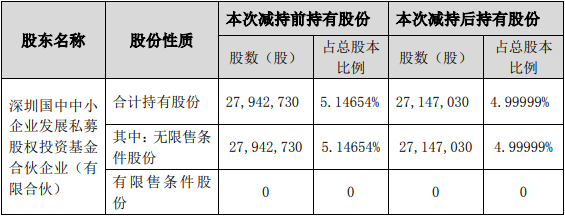 本次权益变动前,中小基金持有公司股份27,942,730股,约占公司总股本的5.14654%;本次权益变动后,中小基金持有公司股份27,147,030股,约占公司总股本的4.99999%,不再是公司持股5%以上股东。
