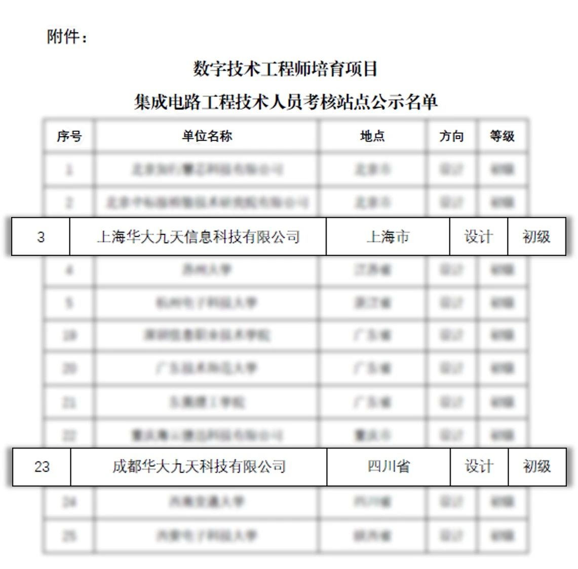 2024年1月22日,工业和信息化部电子工业标准化研究院根据人力资源和社会保障部《专业技术人才知识更新工程数字技术工程师培育项目实施办法》的工作要求,通过公开征集、专家评审,并与地方人社部门沟通后,公布首批数字技术工程师培育项目(集成电路)考核站点。其中,作为北京华大九天科技股份有限公司的全资子公司,上海华大九天及成都华大九天入选首批集成电路工程技术人员考核站点单位。